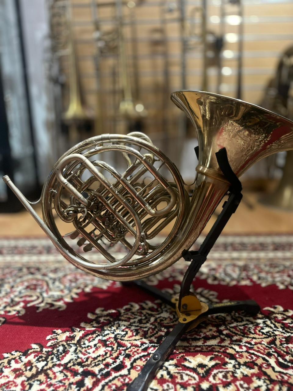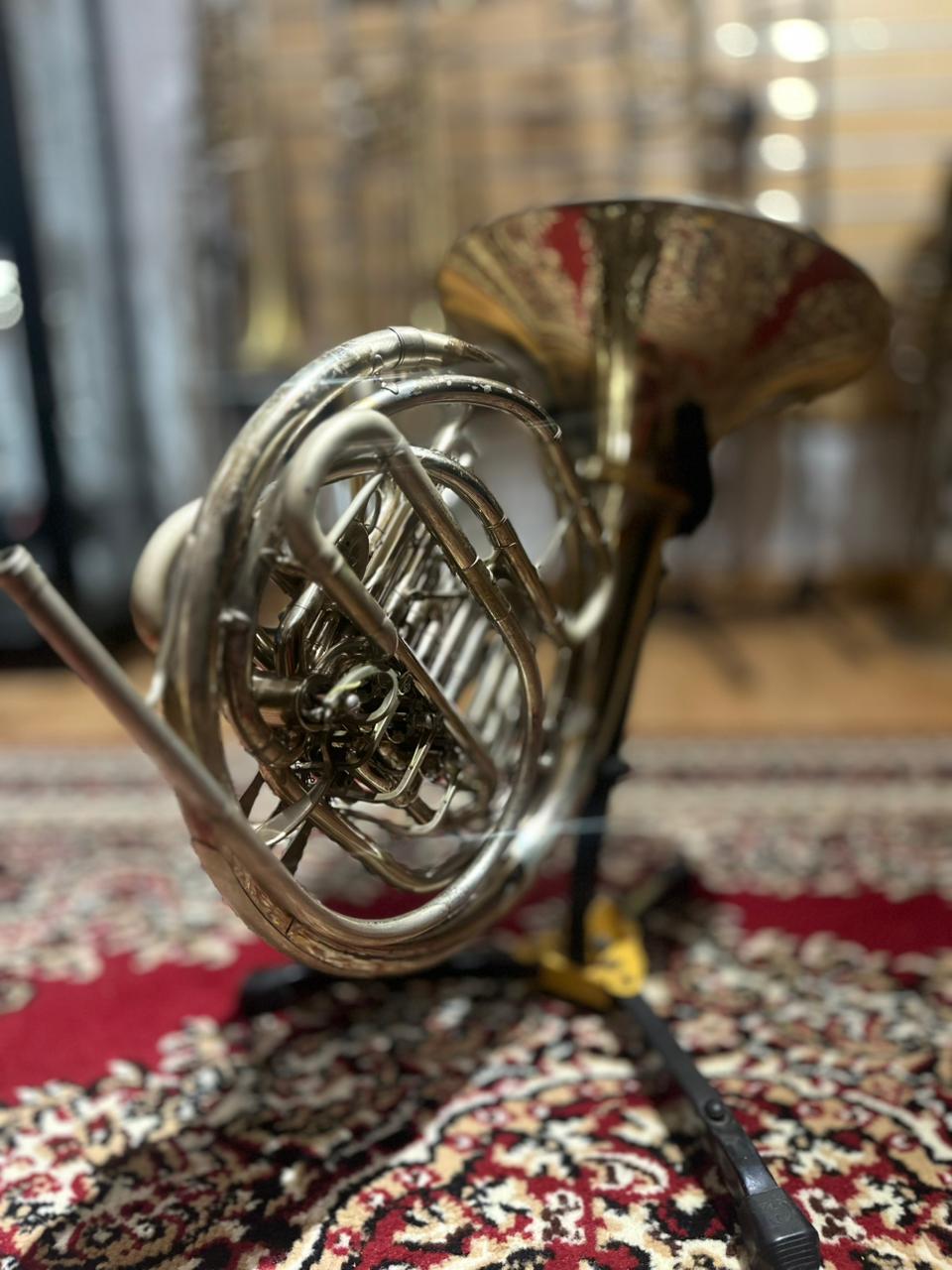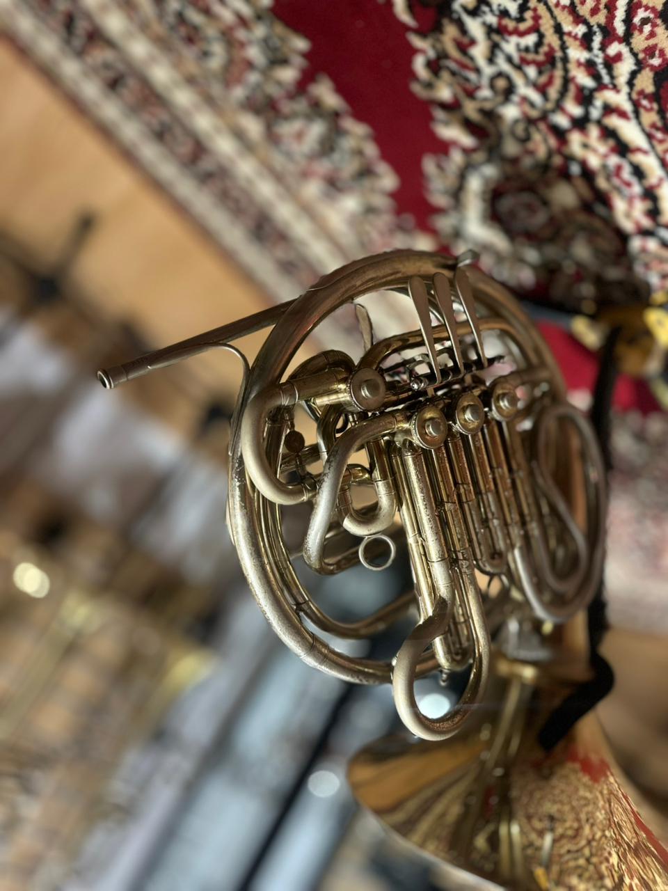 This used instrument is in very good playing condition. The rotary valves operate smoothly, slides function properly, and the horn has been professionally inspected to ensure reliable performance. Natural cosmetic wear is present, consistent with its age, but does not affect sound or playability.