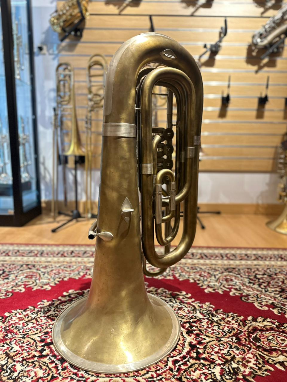 This used instrument is in very good playing condition. The rotary valves operate smoothly and quietly, tuning slides function properly, and the tuba has been professionally inspected to ensure reliable performance. Cosmetic wear and natural oxidation are present, consistent with raw brass and normal use, but they do not affect sound or playability.