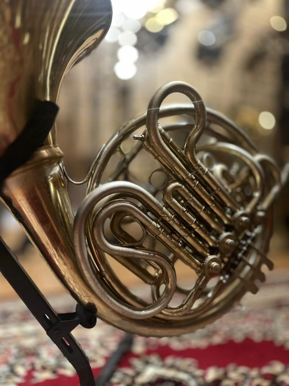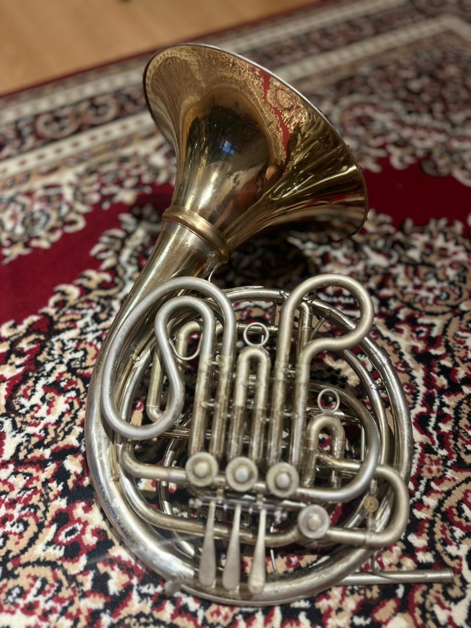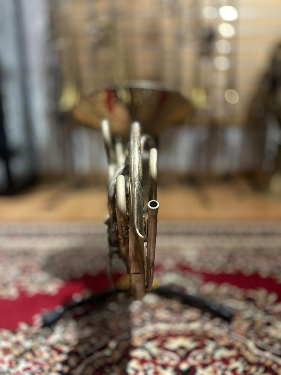 This used instrument is in very good playing condition. The rotary valves operate smoothly, slides function properly, and the horn has been professionally inspected to ensure reliable performance. Natural cosmetic wear is present, consistent with its age, but does not affect sound or playability.