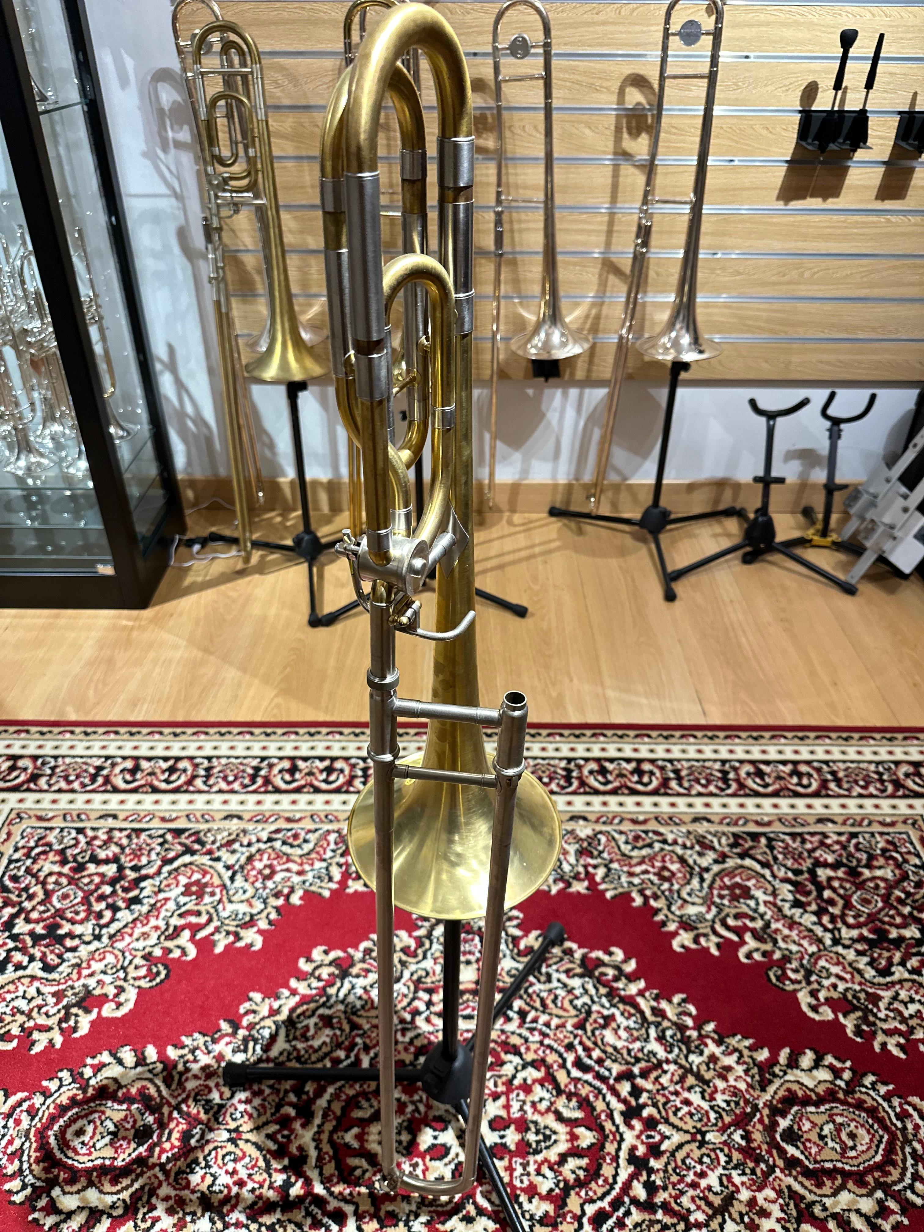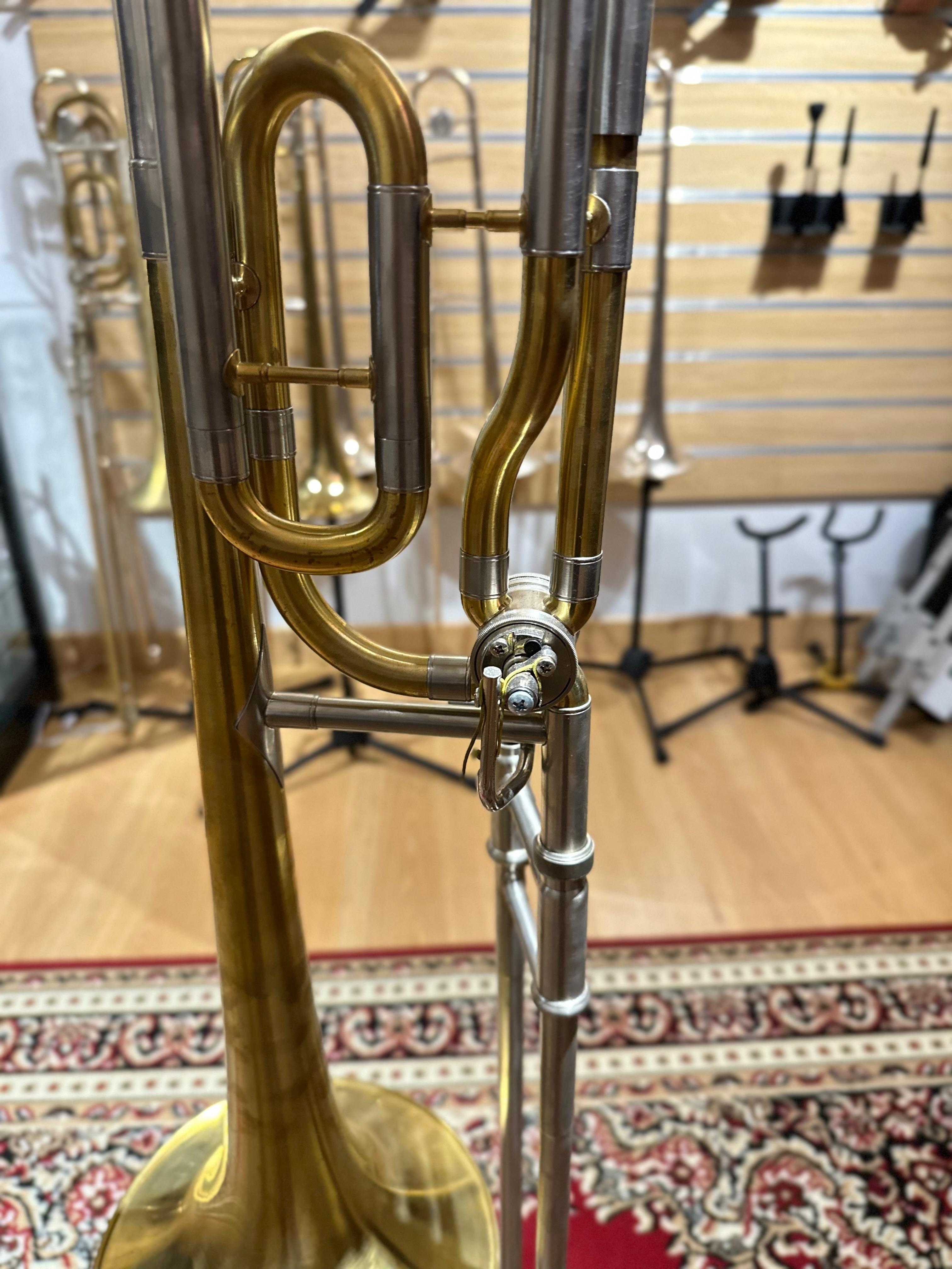 This used trombone is in very good playing condition. The slide moves smoothly with proper alignment, the F-attachment functions well, and the instrument has been professionally inspected to ensure reliable performance. Cosmetic wear and natural oxidation are present, consistent with raw brass and normal use, and do not affect sound or playability.