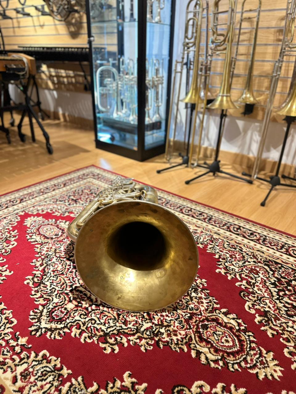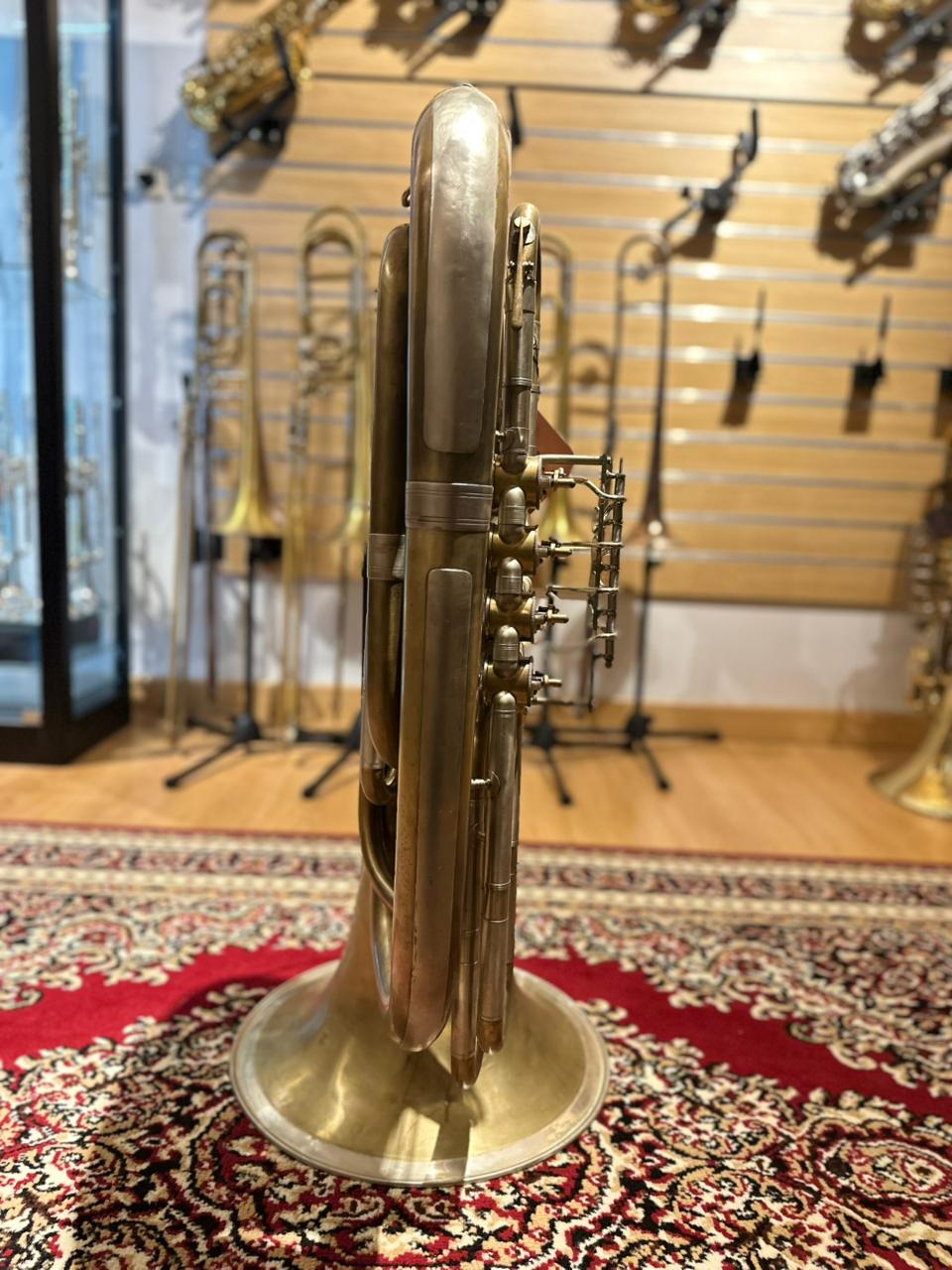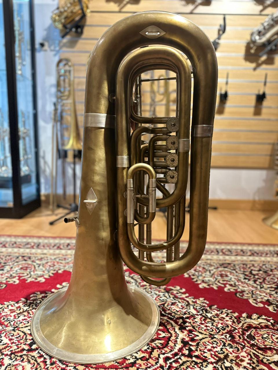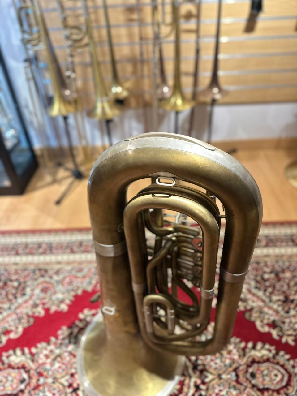 This used instrument is in very good playing condition. The rotary valves operate smoothly and quietly, tuning slides function properly, and the tuba has been professionally inspected to ensure reliable performance. Cosmetic wear and natural oxidation are present, consistent with raw brass and normal use, but they do not affect sound or playability.
